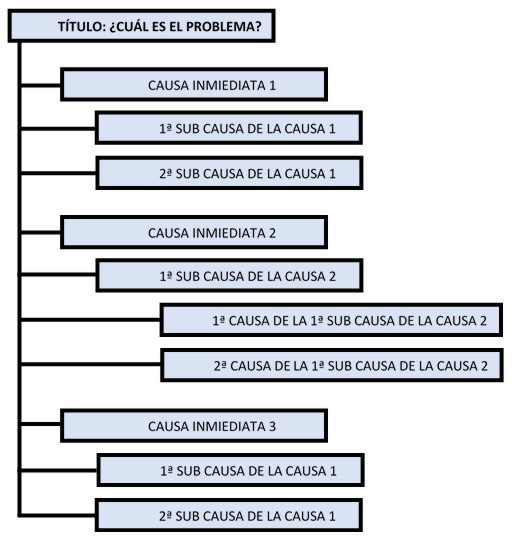 Evidentemente, la mayoría de los problemas son más complejos y son resultado de la confluencia de más de una. Cada causa se encadena con otras sub-causas, que a su vez proceden de otras, la construcción del árbol de causas es la siguiente: