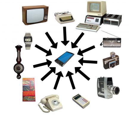 Un ejemplo gráfico de una de las utilidades prácticas de la tecnología digital frente a la analógica es el que se muestra. Un solo dispositivo es capaz de aglutinar múltiples funciones: