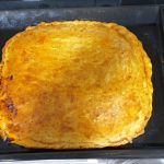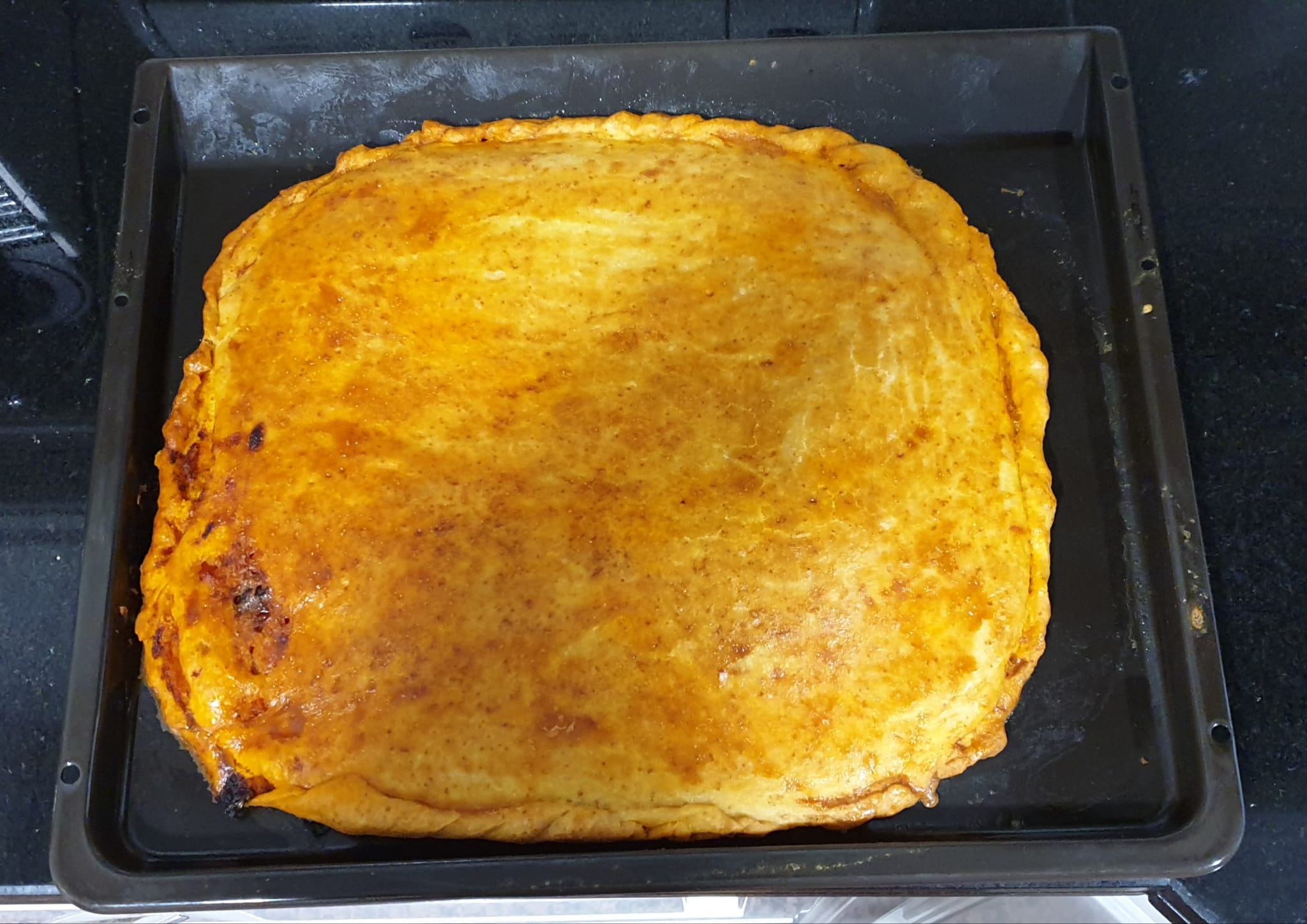 Extendemos con un rodillo una de las partes de la masa y la colocamos en una fuente de horno que habremos puesto a precalentar a 200º. Sobre ella volcamos y repartimos uniformemente el relleno. Una vez homogeneizado disponemos sobre él la mitad de la masa que teníamos reservada y cubrimos y cerramos la empanada. Con una brocha se “pinta” la superficie con un huevo batido.
