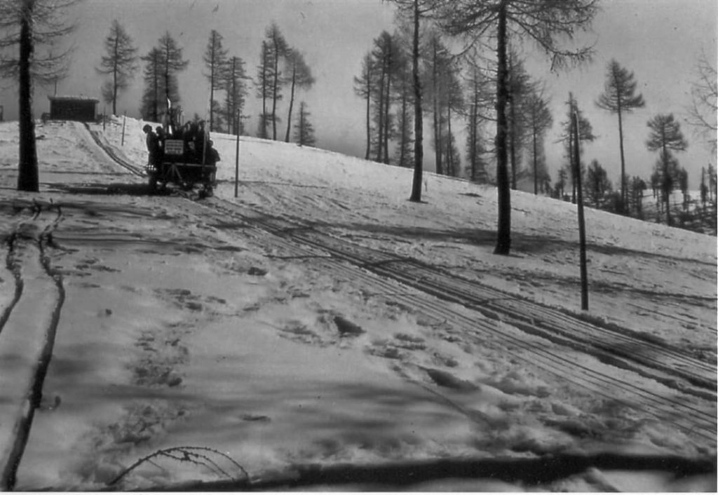 Este artilugio era una simple plataforma dotada de dos patines (esquíes) que le permitían deslizarse por una senda de pendiente bastante uniforme, necesariamente cubierta de nieve y que podía trasportar en sus banquetas a un grupito de atrevidos deportistas innovadores que, con sus tablas de maderas bajaban las pendientes que lo slittone, gracias a la fuerza de su torno de arrastre, había vencido.
